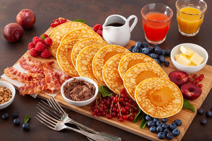 Достаньте все, что «на грани»: полпачки творога, остатки красной рыбы, надоевшее варенье. Нарежьте, разложите по пиалам – и пусть каждый соберет свой идеальный блин.