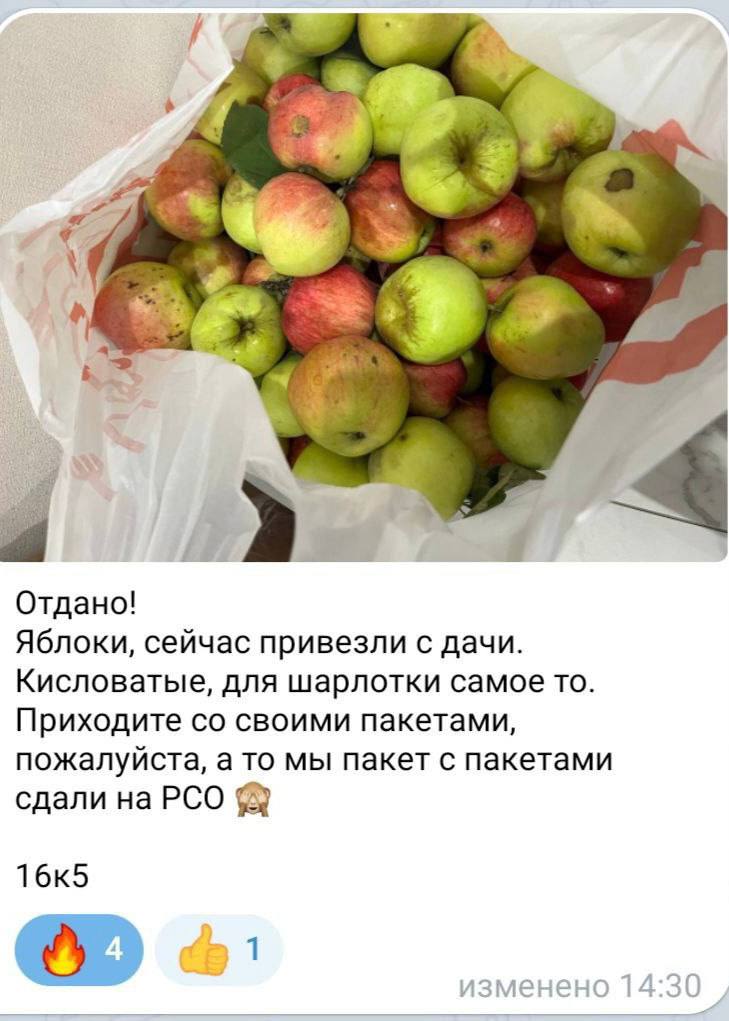 С недавних пор жильцы многоквартирных домов создают чаты в мессенджерах для удобства обсуждения насущных вопросов с соседями. В чатах можно делать объявления, в том числе по типу «бесплатно отдам» – мебель, технику, а также хорошие ненужные продукты. Некоторые волонтеры фудшеринга, забирая через фудшеринг-сервисы продукты для раздачи, публикуют потом объявления именно в чатах своих ЖК. Там же легко найти семьи с детьми, пенсионеров и других нуждающихся в продуктовой помощи.